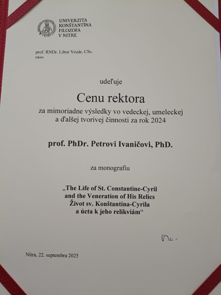 Pri príležitosti otvorenia školského roka 2025/2026 na Univerzite Konštantína Filozofa v Nitre bola prof. Petrovi Ivaničovi odovzdaná Cena rektora za mimoriadne výsledky vo vedeckej, umeleckej a ďalšej tvorivej činnosti za rok 2024 v kategórii monografické dielo za publikáciu The Life of St. Constantine-Cyril and the Veneration of His Relics (Život sv. Konštantína-Cyrila a úcta k jeho relikviám). Toto prestížne ocenenie udeľuje rektor univerzity každoročne pracovníkom univerzity, ktorí svojou vedecko-výskumnou činnosťou prispievajú k rozvoju akademického prostredia a šíreniu poznania.